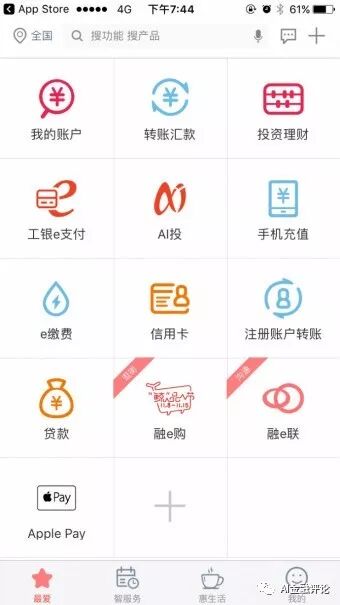 记者第一时间在工商银行的手机银行“融e行”上查看体验“AI投”的具体使用情况:打开“融e行”在首 页,即可看到“AI投”处于中心的位置。