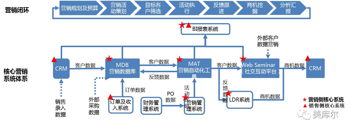 -BI(Business Intelligence)商务智能系统:整个链条的一头一尾,包括结合市场研究,发现业务问题和市场动向,驱动营销策划,制定标准化报表来追踪营销结果。