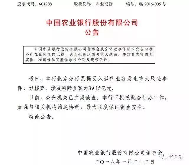 当年1月,就爆发了农业银行北京分行39亿票据案。