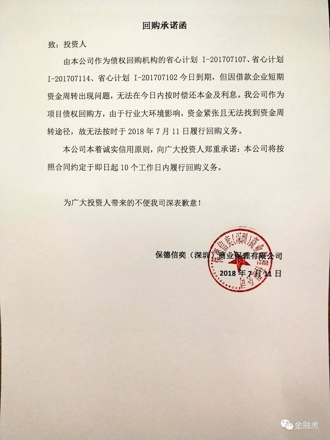爱投资同时表示,项目债权回购方保德信奕(深圳)商业保理有限公司表示由于行业大环境影响,原借款企业资金紧张,目前正积极与借款方沟通还款方案,保理公司无法于2018年7月11日履行回购,但承诺在10个工作日内履行回购义务。公告还贴出了保德信奕(深圳)商业保理有限公司回购承诺函。