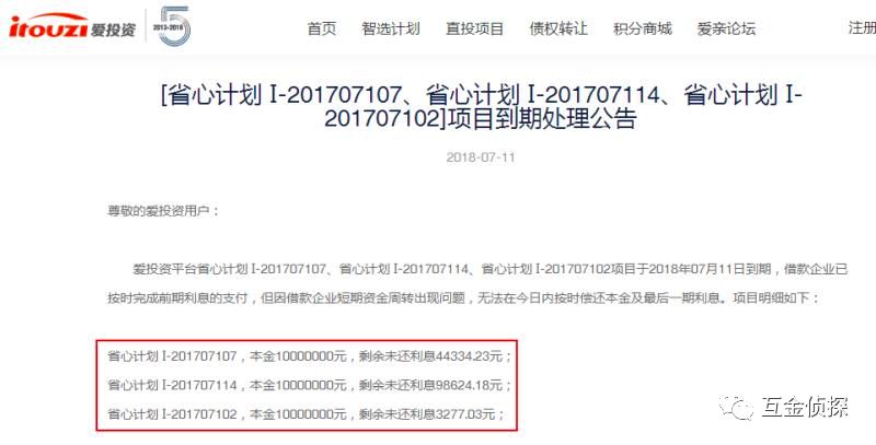 爱投资在公告中称,平台省心计划 I-201707107、省心计划 I-201707114、省心计划 I-201707102项目于2018年07月11日到期,借款企业已按时完成前期利息的支付,但因借款企业短期资金周转出现问题,无法在今日内按时偿还本金及最后一期利息。