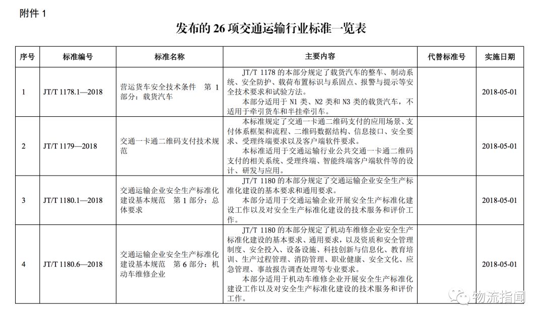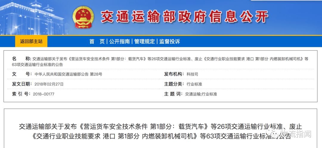 2月27日,交通部发布了《营运货车安全技术条件 第1部分:载货汽车》等26项交通运输行业标准和废止《交通行业职业技能要求 港口 第1部分 内燃装卸机械司机》等63项交通运输行业标准的两则公告。26项交通运输行业标准统一在2018年5月1日起实施。
